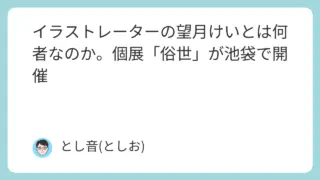 芸能タレント イラストレーターの望月けいは何者なのか。個展「俗世」が池袋で開催 イラストレーターの望月けいさんは、鋭い線と大胆な色彩で独自の世界観を描き出す新世代アーティストです。『Fate/Grand Order』や『刀剣乱舞』など人気作品のキャラクターデザインを手掛け、国内外からの注目を集めています。そんな望月さん... 2025.09.18 芸能タレント