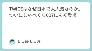 芸能タレント TWICEは日本でなぜ人気なのか。ついにしゃべくり007にも初登場 韓国発の9人組ガールズグループのTWICE。日本では韓国の人気と比べ、より幅広い層に愛されてる印象があります。そんなTWICEについて、なぜ日本で大人気になっているのか詳しく知りたいという方は多いのではないでしょうか。今回はTWICEが人気... 2025.09.20 芸能タレント