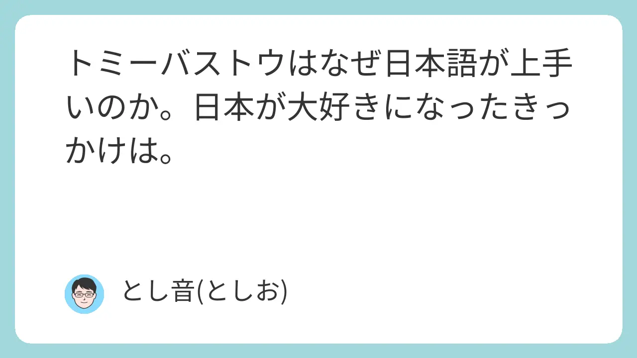 今回は「トミーバストウはなぜ日本語が上手いのか。日本が大好きになったきっかけは」のテーマでお届けしました。